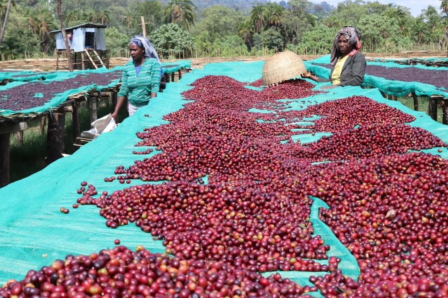 Stazione di lavaggio di Buku Abel, donne imepgnate nella sistemazione delle ciliegie di caffè su letti africani rialzati